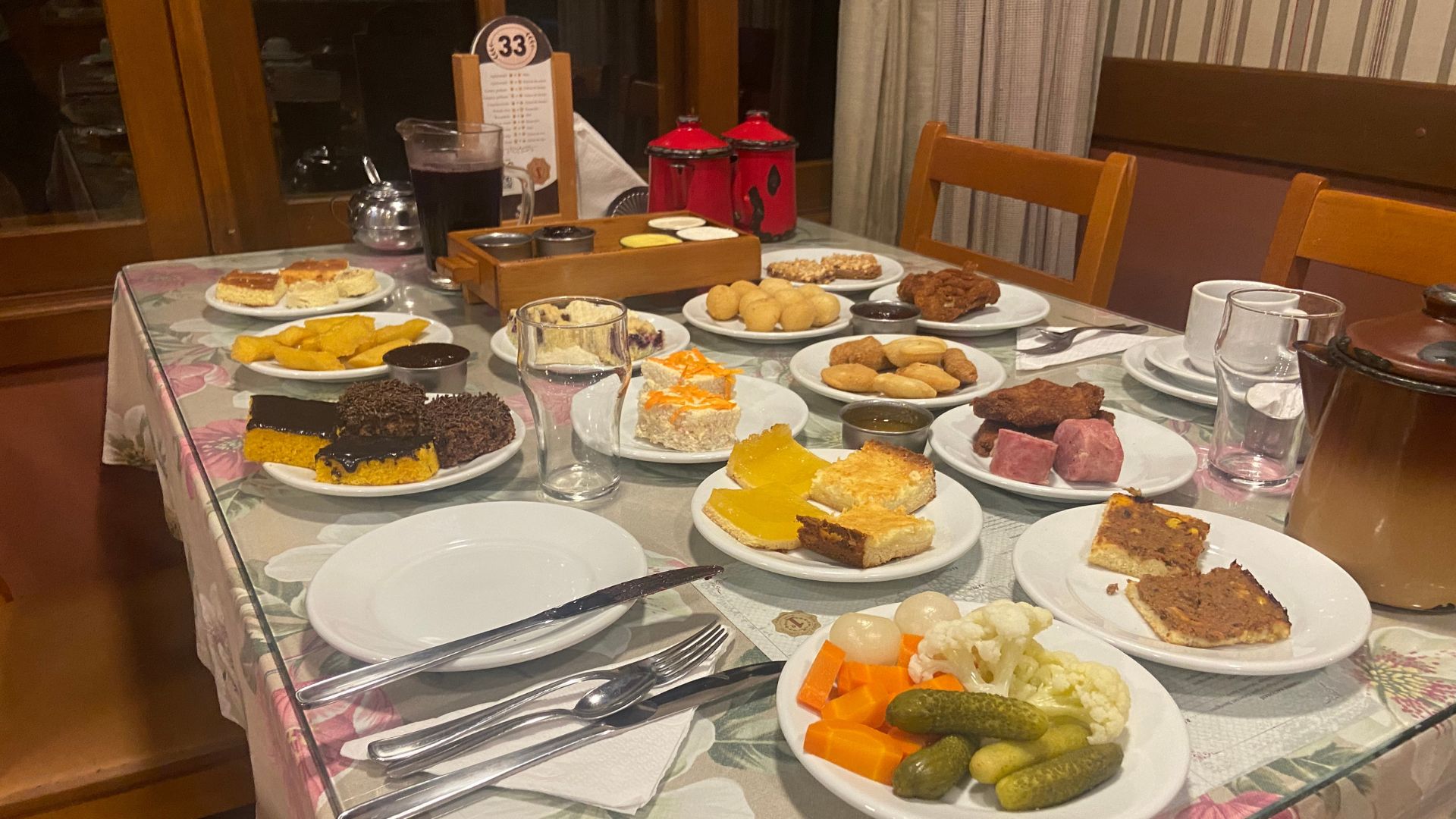 O destaque do Ingresso Café Colonial Bela Vista é sua mesa generosa e diversificada, com mais de 80 opções que você pode repetir à vontade. No cardápio, você encontra desde pães, geleias, frios, bolos, cucas, apfelstrudel, até pratos quentes como lombo de porco, frango à milanesa, risoles, pizzas e polenta. Para completar, as sobremesas se destacam com tortas (como Marta Rocha, Dona Lira, limão, prestígio), quindão, mousses, pudins, sagu, gelatinas, doce em caldas e sorvete italiano artesanal.